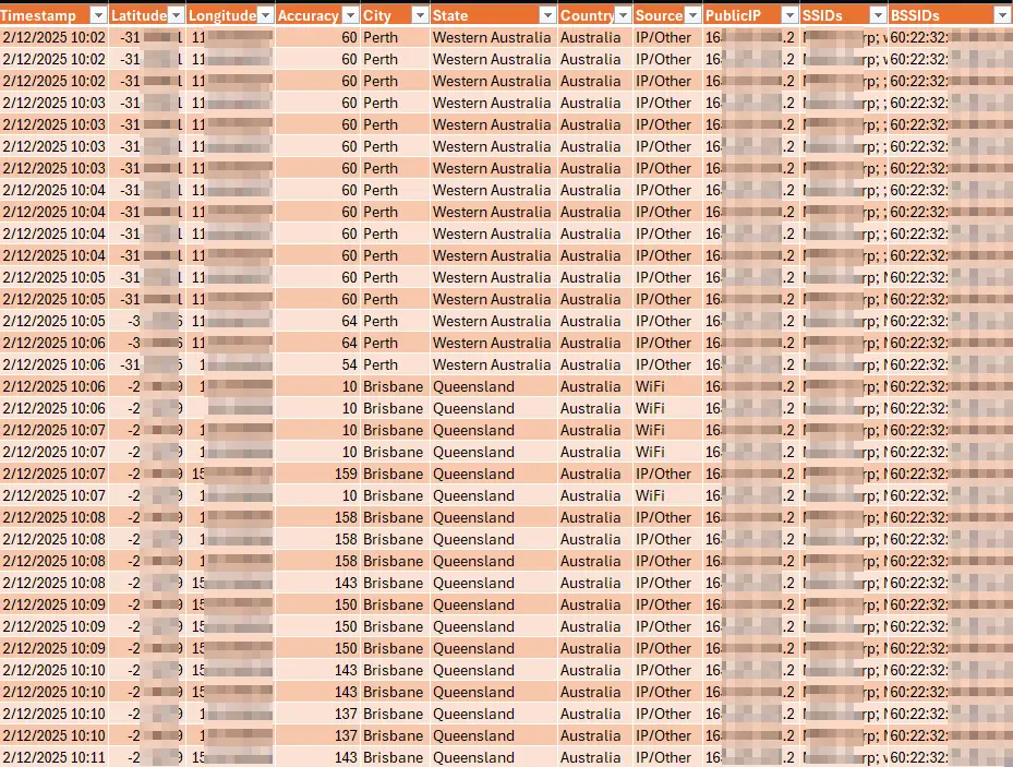 It’s fairly barebones, it uses GeoCoordinateWatcher to pull coordinates, looks them up against OpenStreetMap, and simultaneously scans nearby access points with netsh to capture BSSIDs. It grabs this data every 15 seconds. It’s a bit of a patchwork tool, and there’s plenty of room for refinement, but it collected exactly what I needed.
